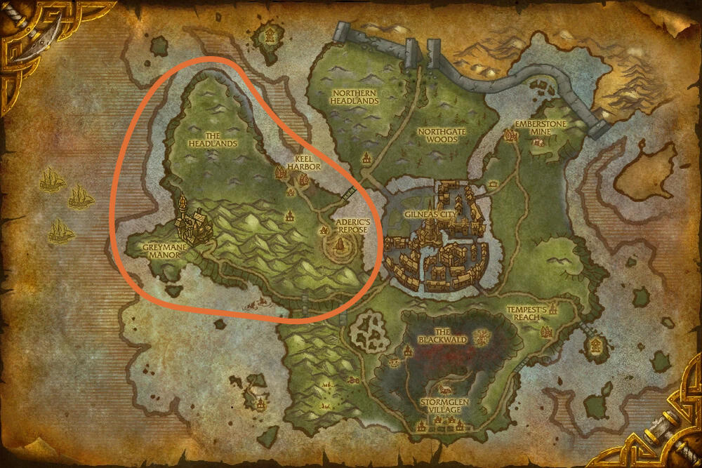Represented by Gilded OaksThe path and the immediate areas leading up to the Greymane Manor in the zone of Gilneas, is a cliffside bordering both the sea and more mountains, making the Gilded Oaks a reasonable stand-in for this area.The Greymane Manor itself is not considered to be a part of the Neighbourhood.